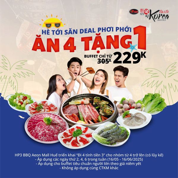Mùa hè sôi động ăn ngon không lo “cháy” ví, vì HP3 BBQ Aeon Mall Huế mang đến ưu đãi cực hời dành riêng cho hè này: Ăn 4 tặng 1 - Càng đi đông, càng tiết kiệm!