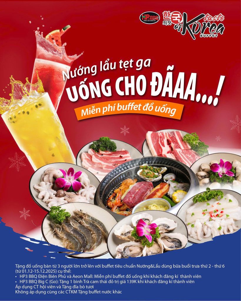 - Tặng đồ uống bàn từ 3 trở lên với buffet tiêu chuẩn Nướng&Lẩu người lớn buổi trưa thứ 2-thứ 6 (từ 01.12-15.12.2025) cụ thể: