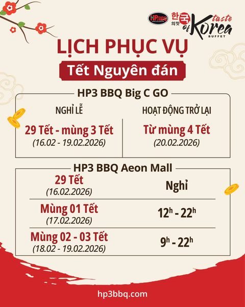 🎉 Tụ điểm mở tiệc tất niên vui tới bến cùng gia đình, bạn bè hay đồng nghiệp gọi tên HP3 BBQ với: